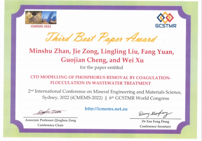 近日,基于公司牽頭承擔(dān)的集團公司2019年度重大科技創(chuàng)新項目《污水處理新型藥劑開發(fā)及投加量優(yōu)化控制研究與示范》的“除磷藥劑智能投加系統(tǒng)”技術(shù)成果完成的《CFD Modelling of Phosphorus Removal by Coagulation-Flocculation in Wastewater Treatment 》論文在第2屆礦物工程與材料科學(xué)國際會議(The 2nd International Conference on Mineral Engineering and Materials Science, 簡稱iCMEMS-2022)上獲評優(yōu)秀論文(三等獎)。