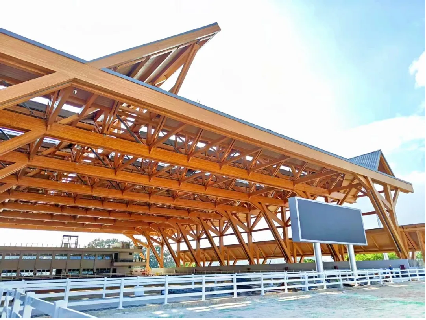 馬術(shù)場館屋頂由73000余個、直徑20毫米的膠合木螺栓鎖住。單榀(雙拼)木梁最大長度達(dá)96米,木梁跨度66米,最大懸挑20米,系國內(nèi)最大跨度的木結(jié)構(gòu)體育建筑。 項目時間緊、工藝復(fù)雜,項目團隊勠力同心、攻堅克難,科學(xué)擬定項目計劃,合力安排專業(yè)工序,統(tǒng)籌調(diào)配資源要素,積極配合現(xiàn)場施工,為項目如期交付奠定堅實基礎(chǔ)。